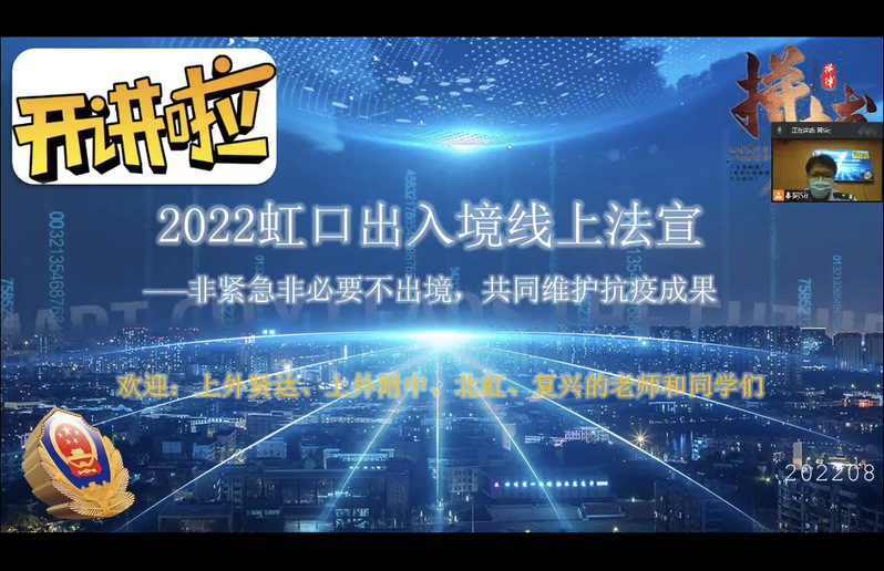 为加强对虹口辖区内学校学生的法律法规教育、提高学生的法律意识,同时就疫情期间的最新出入境政策、护照办理要求等重要信息进行宣讲,8月2日上午,上海市虹口区出入境赵警官为辖区内相关学校开展了一场精彩的在线法宣讲座。