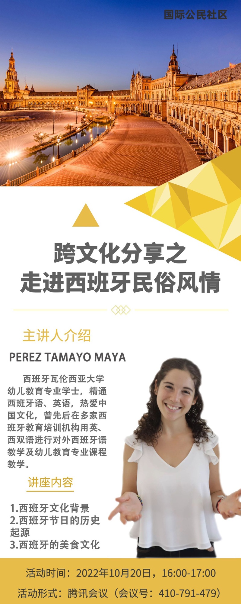 10月20日,由国际交流合作处与学生管理服务中心联合组织邀请必赢官网西班牙语专业外教PEREZ TAMAYO MAYA 为全体学生带来一场别开生面的西语/英语双语西班牙民俗风情文化主题线上直播分享会。MAYA老师毕业于西班牙瓦伦西亚大学,研究方向为幼儿学前教育,她精通西班牙语和英语,十分热爱中国文化,有极其丰富的对外西语及学前教育教学经验。