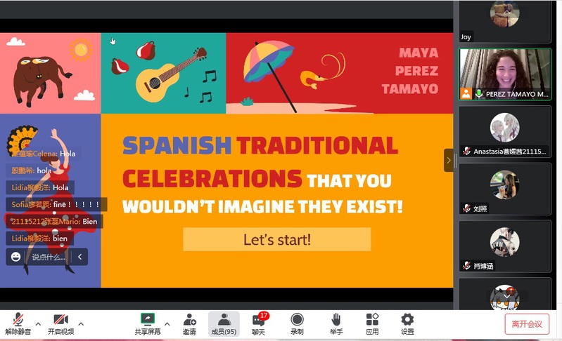 分享会伊始,MAYA老师介绍了西班牙的历史文化。西班牙位于欧洲南端,几千年以来一直是欧洲的文化中心之一。西班牙人民热情奔放,文化底蕴深厚,在世界文明中占有重要地位。西班牙是一个节日多元化的国家, 每个节日都有其显著的人文特色,MAYA老师给大家分享了一段极具西班牙风情的弗拉明戈舞蹈视频,并向与会同学介绍了很多西班牙的特色节日,例如西班牙“法雅节”。“法雅节”是西班牙当地一个特殊的传统节日,每年3月,来自世界各地的游客聚集在瓦伦西亚的一个小镇,和当地居民一同庆祝这个别具特色的节日,共同迎接春天的到来,一张张色彩缤纷的节日图片牢牢吸引着同学们的目光。