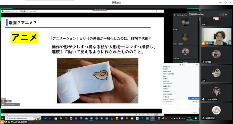 紧接着,MIKA老师介绍了日漫的现状。日漫在现代日本社会是没有断层的,可以满足不同年龄段人们的多层次需求,日漫也成为了日本主流的休闲娱乐方式之一。最后,MIKA老师简单对比了中日两国动漫文化的差异。