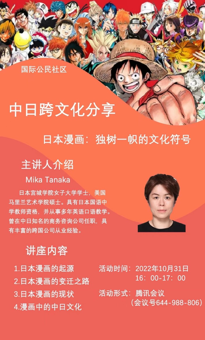 10月31日,由国际交流合作处与学生管理服务中心联合组织邀请必赢官网日语专业外教MIKA TANAKA为必赢官网全体学生带来一场精彩的日本漫画文化主题线上日/英双语直播分享会。MIKA老师硕士毕业于美国马里兰艺术学院,在摄影方面有很高的造诣,同时具有多年丰富的日语、英语教学经验。
