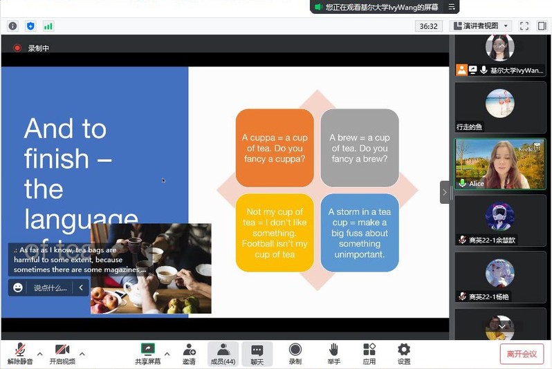 分享会的最后,Alice老师与大家分享了一些和茶有关的英语习惯表达和其引申出的含义。此次分享会内容丰富有趣,Alice老师和Ivy老师的讲解幽默、生动,细致入微,同学们积极互动,踊跃提问,大家对中英的茶文化都产生了浓烈的兴趣。整场分享会大家如置身在英伦午后阳光,三五好友,于一方茶席,沏一壶清茶,起看云卷云舒,静看花开花落,不争不急,一切简单,舒适而自在。