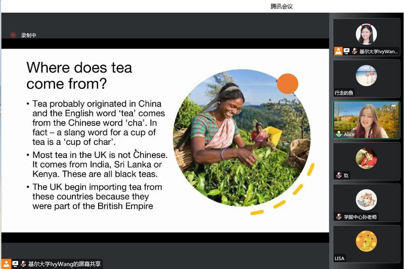 本次线上分享会,Alice老师首先从英国下午茶的悠久历史和起源,以及与中国茶的关系切入,介绍英国当前社会流行的茶文化,包括英国茶叶的巨大消耗量、下午茶的广泛普及度和英国人传统的饮茶习惯等。Alice老师是一位喜欢旅行,喜欢喝茶的英国小姐姐,她风趣幽默,用纯正的英式口音讲解着自己作为英国人的下午茶习惯, Ivy老师结合她在英国多年的留学生活经验,不时和同学们分享她在英国留学时因为中英文化的差异在饮茶方式上发生的趣事。
