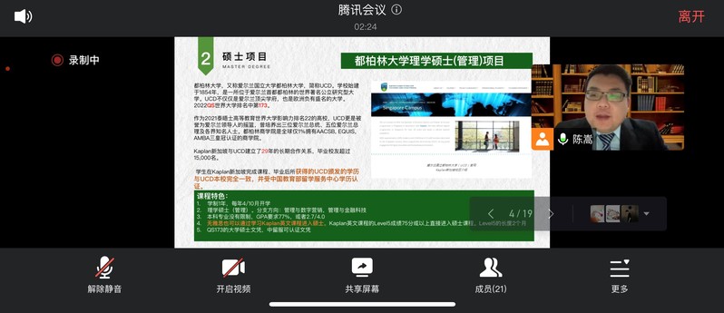 陈老师代表项目方对参会的贤达学生表达了欢迎之情。他首先分享了爱尔兰都柏林大学一年制硕士课程(新加坡在读)的课程设置和录取要求,针对同学们申请硕士项目需要做哪些准备给出了细致而周全的建议,并对研究生毕业后应该如何在海外找工作和办理工作签证等列出相应注意事项并做出详细解答。