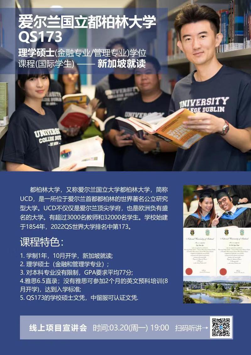 同学们认真聆听,与爱尔兰都柏林大学项目方老师积极互动。陈老师也耐心解答了学生提出的各种学术专业问题。都柏林大学,又称爱尔兰国立大学都柏林大学,简称UCD,是一所位于爱尔兰首都都柏林的世界著名公立研究型大学。UCD不仅仅是爱尔兰顶尖学府,也是欧洲负有盛名的大学。有超过3000名教师和32000名学生。学校始建于1854年,2022QS世界大学排名中位列第173。