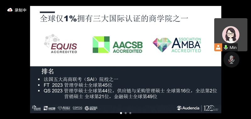 分享会伊始,法方老师代表南特高等商学院对参会的贤达学子表达了欢迎。她首先介绍了法国独特的高等教育体系,并从悠久的历史、几个校区优越的地理位置、商科顶尖的世界排名、高度国际化的学习氛围、为学生提供的良好就业支持等方面对南特高商进行了详细的介绍。南特高商是全球仅1%拥有三大国际认证的商学院之一,拥有来自124个国家的学生和来自86个国家的教授团队,并与法国境内外700余家企业保持紧密合作,让学生接受顶尖商科教学的同时,能了解不同国家的文化,拓展国际视野,有机会得到跨国工作的宝贵机会。