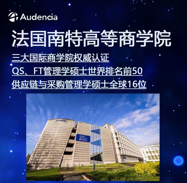 法国南特高等商学院(AUDENCIA),创办于1900年,主校区位于全法第6大城市,也是欧洲宜居城市南特。法国南特高商是欧洲顶级高等商学院(grande école),是法国SAI五校联考的一员,也是最富盛名的法兰西精英教育系统大学校的成员。在2023年QS排名中,管理学硕士全球第44位,供应链与采购管理硕士全球第16位、全法第2位,营销硕士全球第21位,金融硕士全球第49位。
