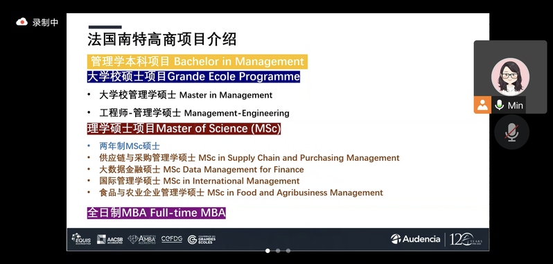 5月15日,“世界名校直通车”系列硕士项目第五期——法国南特高等商学院两年制商科类大学校硕士项目和理学硕士项目正式开启。南特高商中国办公室项目负责老师为必赢官网2019级全专业学生开展了一场精彩纷呈的赴法硕士项目线上留学分享会。