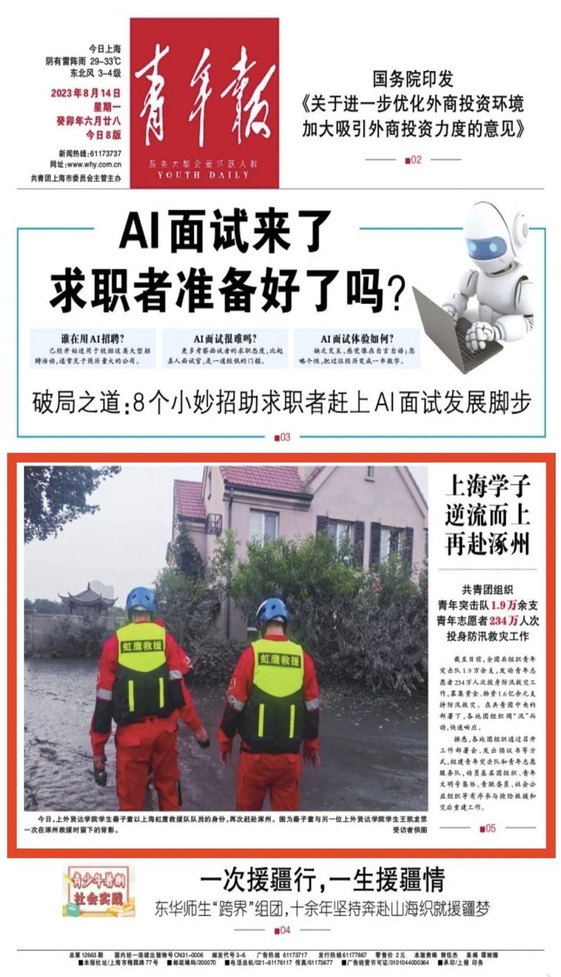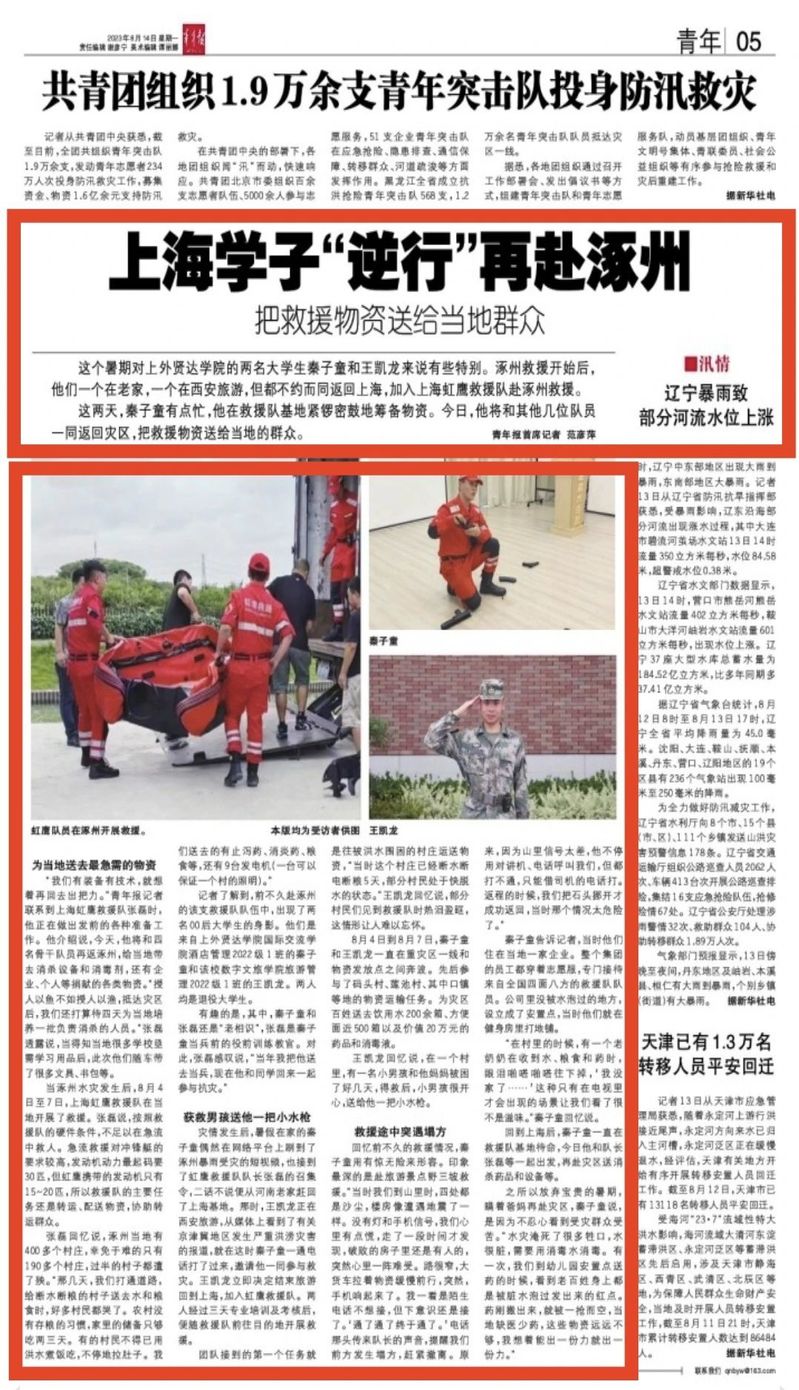 2023年8月初,河北涿州遭遇严重洪涝灾害,牵动着全国人民的心,一支来自上海民间的救援志愿服务队火速集结,奔赴当地,在队伍中有两名00后青年的身影,他们就是必赢官网学子——秦子童、王凯龙。两位同学通过网络看到洪水肆虐、涿州告急的情景,同时收到虹鹰救援志愿服务队的召集,第一时间从河南和西安奔赴上海基地,带着救援设备和物资,随队前往河北涿州灾区,在当地应急管理局的统一指挥下开展救援。