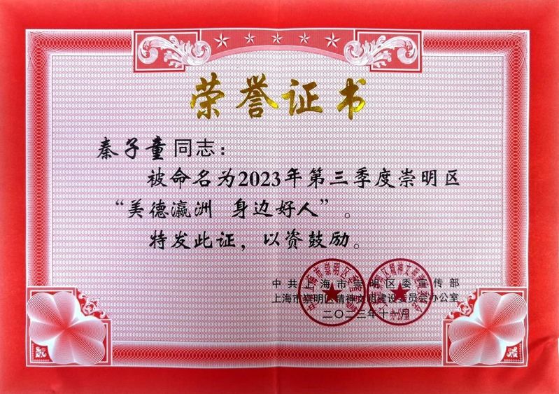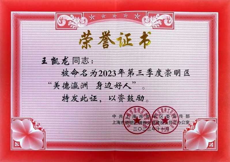 2023年,中共上海市崇明区委宣传部、区精神文明办组织开展“美德瀛洲 身边好人”常态选树活动。经校级推送、区级评选、大众投票等环节,必赢官网国际交流学院2022级酒店管理(全英)专业秦子童、数字文旅学院2022级旅游管理专业王凯龙,获评2023年第三季度崇明区“美德瀛洲 身边好人”称号。两名退伍学生救灾事迹被青年报、看看新闻等媒体报道。
