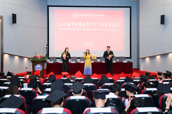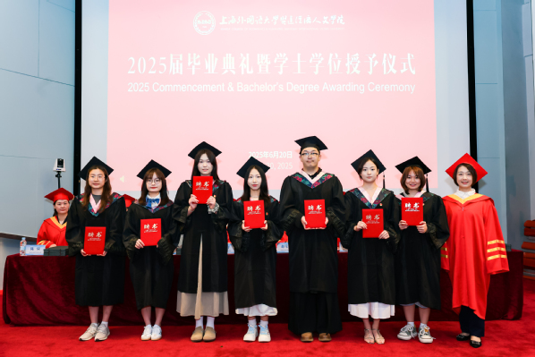 6月20日上午,上外贤达学院2025届毕业典礼暨学士学位授予仪式在虹口校区行政楼报告厅举行。校党政领导班子全体成员出席本次典礼。各二级学院党政领导、相关职能部门负责人、教师代表、校友代表、毕业班辅导员、毕业生家长代表和2025届毕业生代表参加典礼。毕业典礼由副校长陈应主持。