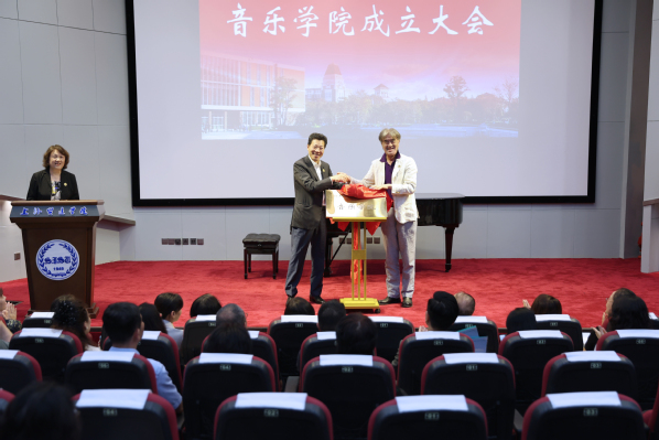 在全场嘉宾的共同见证下,鲍贤嗣董事长与高晓东院长共同为音乐学院揭牌。现场响起热烈的掌声。
