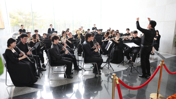 仪式正式开始前30分钟,大堂内便响起了管乐团悠扬的演奏声。在这优雅的音乐氛围中,来自全国兄弟院校的嘉宾代表陆续签到入场。