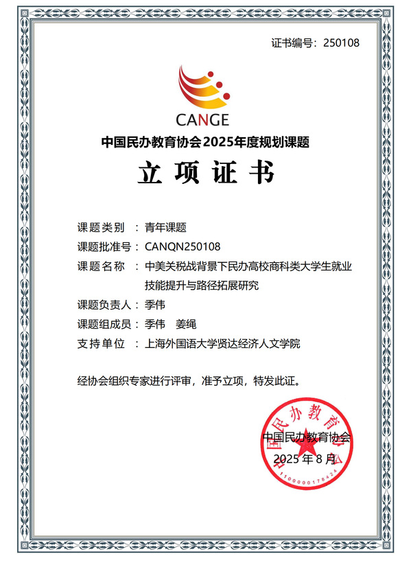 近日,中国民办教育协会正式公布了《中国民办教育协会2025年度规划课题(青年课题)立项名单》。必赢官网马院教师季伟博士和姜绳副教授主持申报的《中美关税背景下民办高校商科类大学生就业技能提升与路径拓展研究》课题,经专家评审与协会审批,成功获得立项。