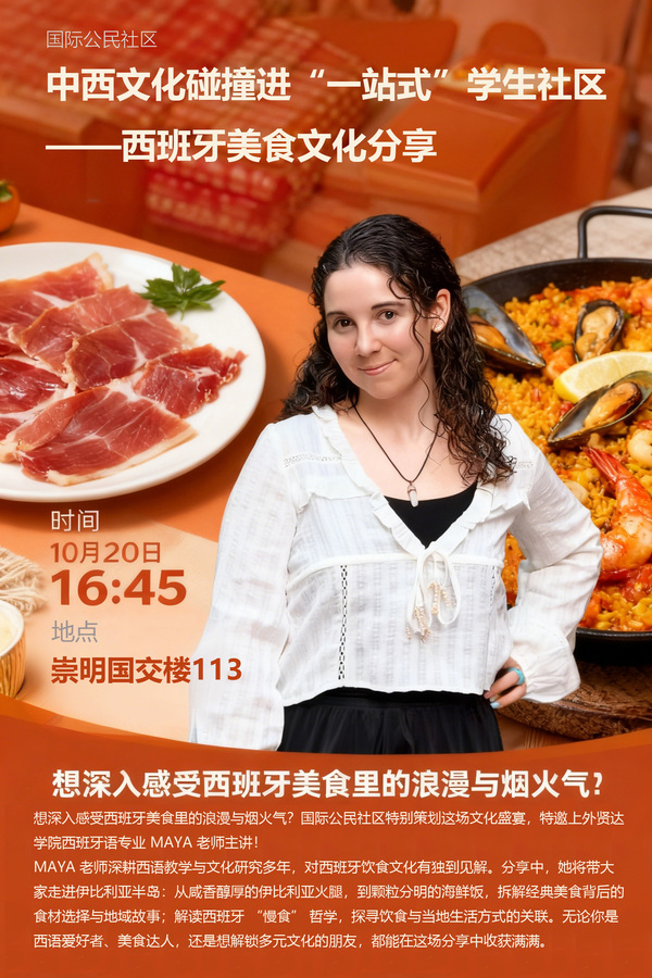 10 月 20 日下午,崇明校区国交楼 113教室暖意融融、文化氛围浓厚,国际公民社区“一站式”系列活动之西班牙美食文化分享会如期举行。这场以美食为媒的跨文化交流活动,吸引了全校众多学生参与,在欢声笑语中完成了一次精彩的中西文化对话。