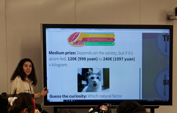 分享过程中,Maya老师以美食为纽带,带领同学们开启了一场跨越山海的西班牙文化之旅。谈及 “火腿界黄金” 伊比利亚火腿时,她不仅细致讲解了火腿的品种选育标准,还讲述了火腿长达数年的腌制工艺背后的地域智慧;而在解析经典海鲜饭时, Maya老师让在场同学们在了解美食制作细节的同时,深刻读懂了每一份食材背后蕴含的情怀与文化底蕴。接着,Maya老师又围绕街头 Tapas 小食文化,讲述了其如何成为西班牙人社交互动的重要载体,让学生对西班牙文化的理解不再停留在美食表面,而是延伸到生活理念的层面。