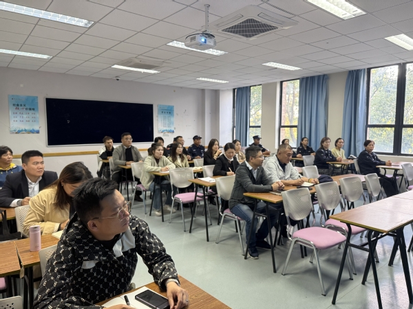 10月22日下午,崇明区消防救援支队走进校园,在综合楼208教室举办了一场消防知识培训讲座。本次活动特邀崇明区消防救援支队宣传科科长黄海华担任主讲,旨在进一步筑牢校园消防安全防线,切实提升关键岗位人员的消防安全意识与应急处置能力。综合运行保障中心副主任顾文辉、后勤保卫处副处长李红光,以及后勤保障人员与宿管人员共同参加学习。培训由学服中心副主任彭煜铭主持。