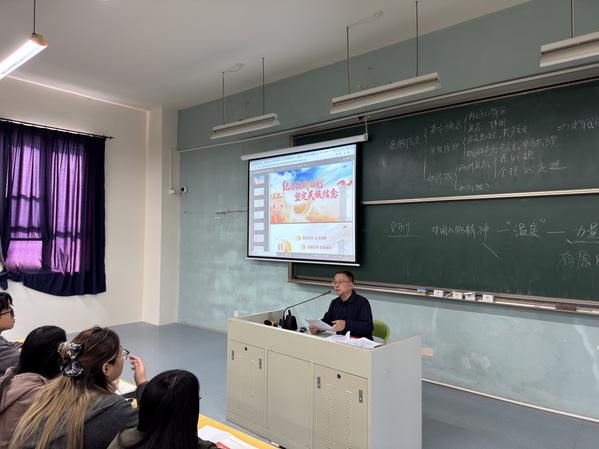 为隆重纪念中国人民抗日战争暨世界反法西斯战争胜利80周年,引导广大学生深刻铭记历史、弘扬抗战精神,10月22日,本学期《形势与政策》课程首场专题报告在崇明校区语信楼316大教室开讲。学校党委书记赵荣善以“伟大抗战精神”为题,为百余名2023级本科生带来了一场深刻而富有教育意义的精彩报告。