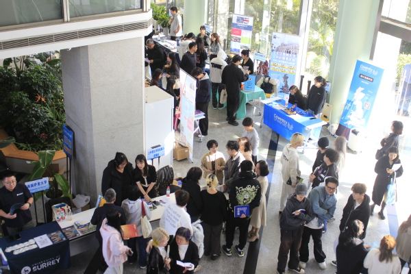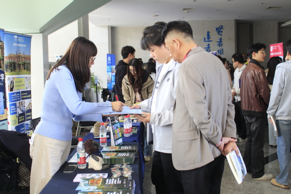 讲座落幕后,海外高校交流会在虹口校区行政楼一楼大厅举行。本次交流会汇聚了来自全球多个国家和地区的优质教育资源:英国萨里大学、东安格利亚大学、肯特大学、布拉德福德大学等知名院校携热门专业亮相,匈牙利多瑙新城大学、加拿大加西大学、新西兰东部理工大学则带来多元化的留学选择,英国文化教育协会更现场提供语言考试咨询服务。