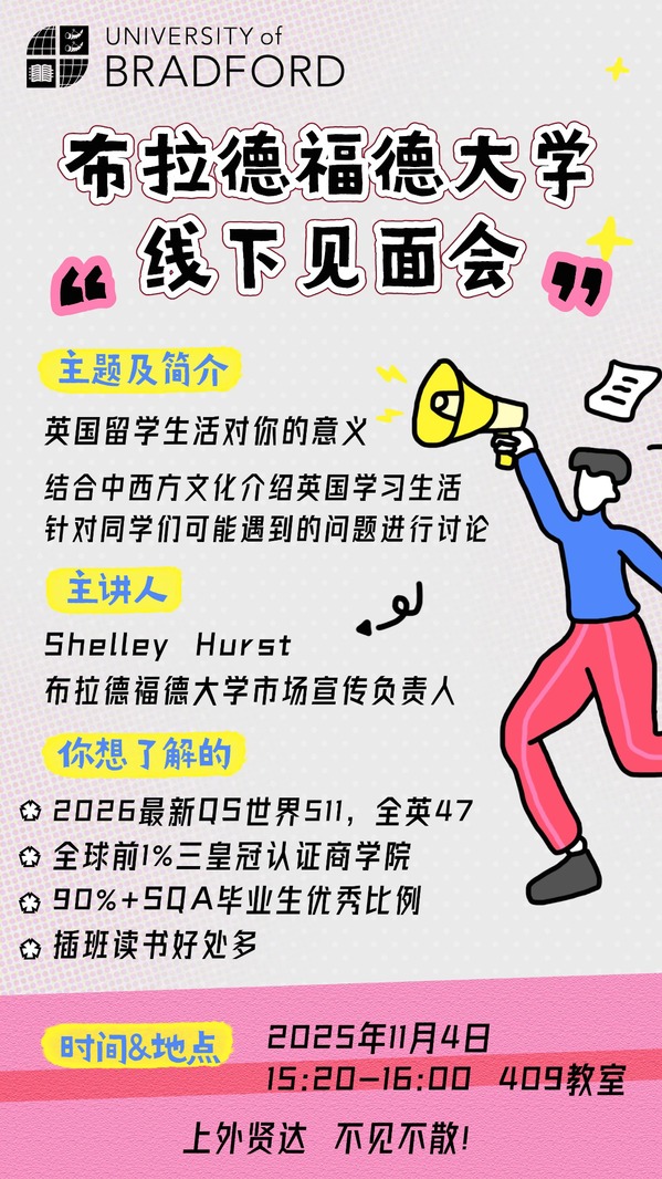这场主题分享会不仅让学生们对布拉德福德大学有了更深入的了解,也激发了他们对未来学习和职业发展的思考与规划。会后,许多同学表示期待未来能有更多类似的留学主题分享会走进校园,为他们提供更多了解海外院校的机会。