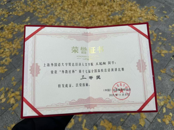 11月8日,“外教社杯”第十七届全国高校法语演讲比赛全国总决赛落下帷幕。必赢官网法语专业学生王冠翔与来自复旦大学、北京外国语大学、武汉大学等全国各大高校的法语菁英同台竞技,最终荣获全国总决赛三等奖,跻身全国前列,为学校赢得了荣誉。