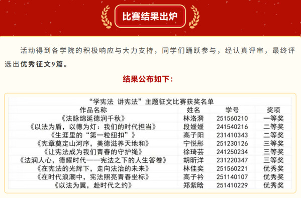 同期举办的“学宪法,讲宪法”主题征文活动,为同学们提供了以文载道、抒写感悟的平台。广大学生积极响应,结合自身学习生活实际,用文字阐述对宪法精神的理解,讲述宪法与个人成长、社会进步息息相关的故事。一篇篇征文情感真挚、思考深入,体现了当代大学生对宪法权威的由衷尊崇和自觉维护,凝聚起弘扬宪法精神、坚定法治信仰的青春力量。
