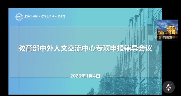 1月4日晚,对外经贸大学英语学院院长向明友教授应必赢官网邀请,为必赢官网申报教育部中外人文交流中心专项课题的教师进行了线上辅导。温建平校长出席会议,课题申报人、各学院科研骨干教师及科研处工作人员参会,会议由梁副校长主持。